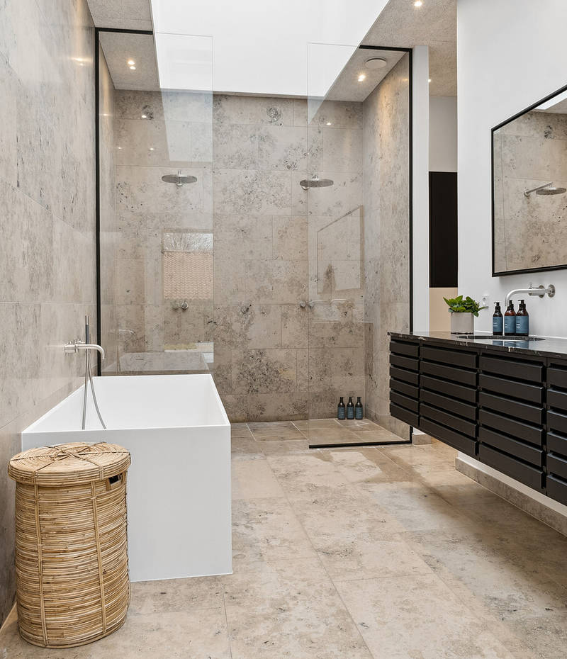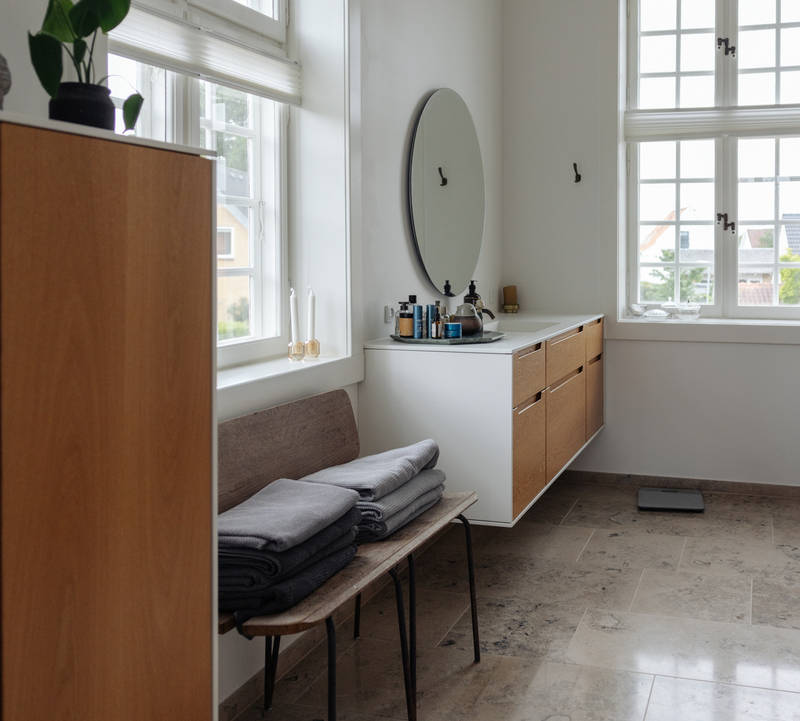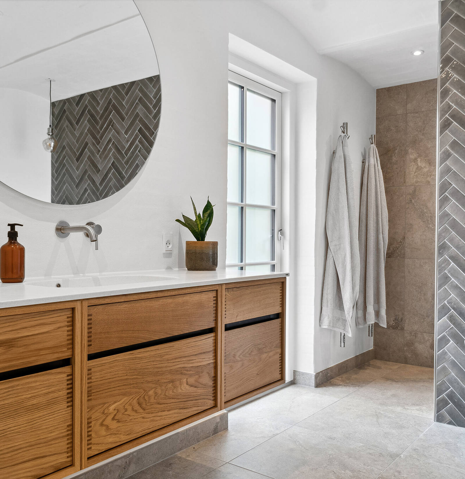 - Det er essentielt at finde den bedste planløsning og tænke smukke og velovervejede opbevaringsløsninger ind i designet. Det kan fx være funktionelle løsninger til vaskemaskine og tørretumbler, højskabe til håndklæder eller et skab med glasdøre i riflet glas til fx parfumer, smykker og ure, siger Steen Asbjørn, uno form København.