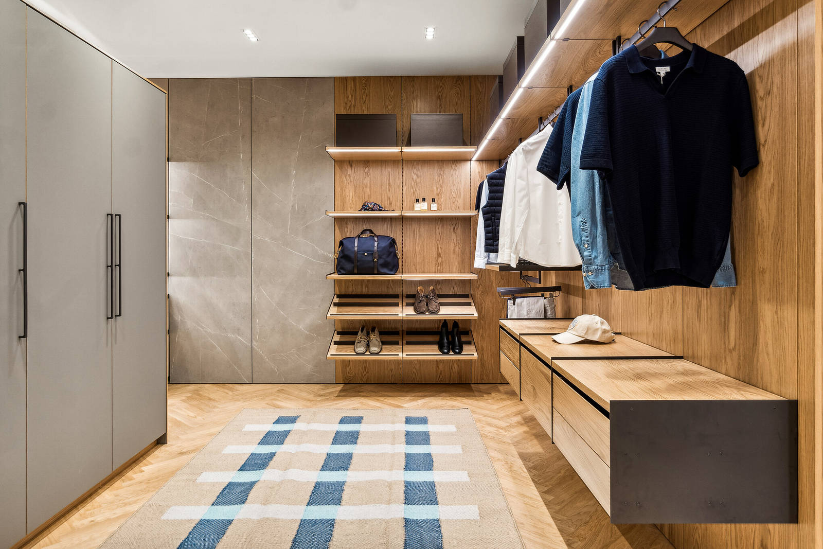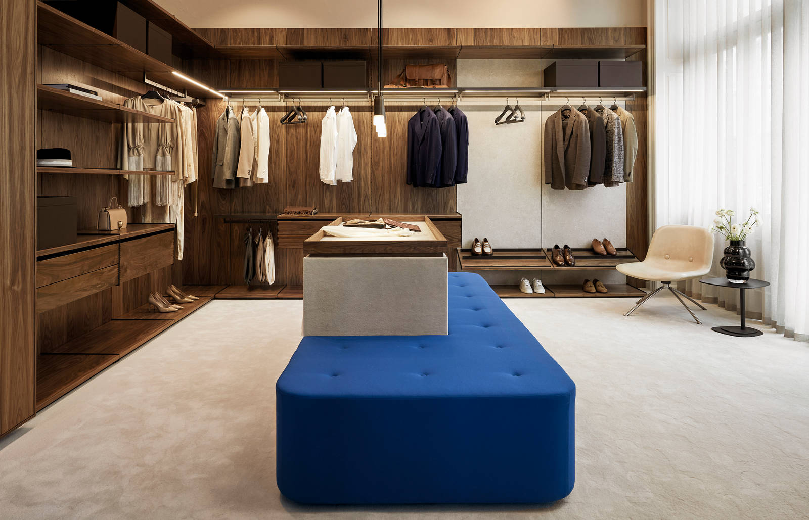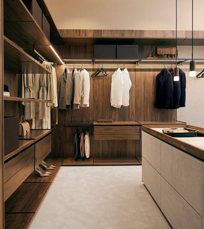 Den nye walk-in kollektion er håndbygget og fleksibel, så den kan skræddersyes til dine behov for opbevaring – med ekstra plads til lange kjoler eller frakker, skrå hylder til sko og fingertappede massive skuffer med inddelere i træ, kunstlæder og velour til briller, smykker eller ure. Sæsontøjet kan opbevares i smukke æsker i kunstlæder i en nuance, der er nøje afstemt til at passe til de udvalgte træsorter, de eksklusive komponenter i Brown Metal Grey og det bronzefarvede glas.