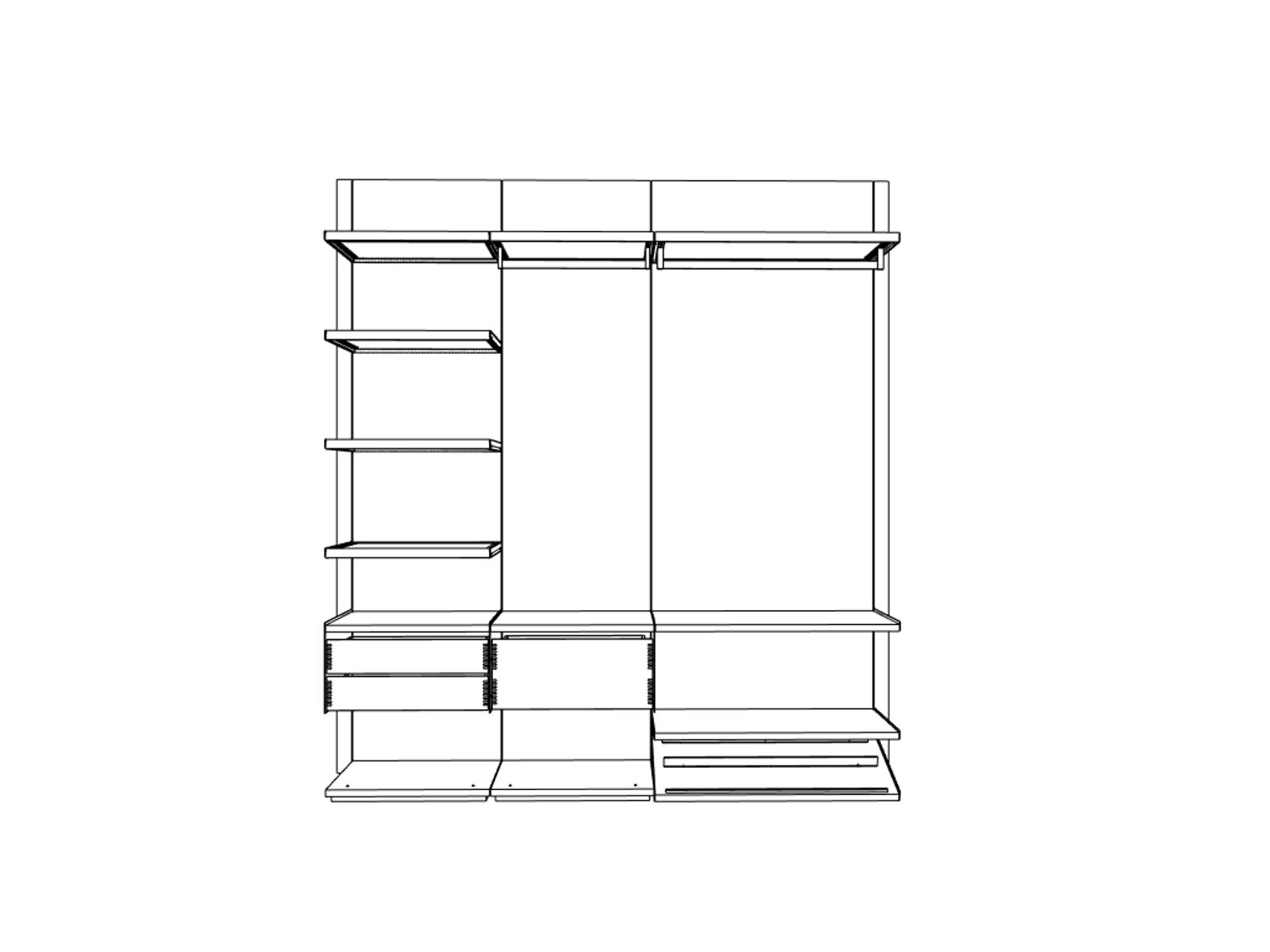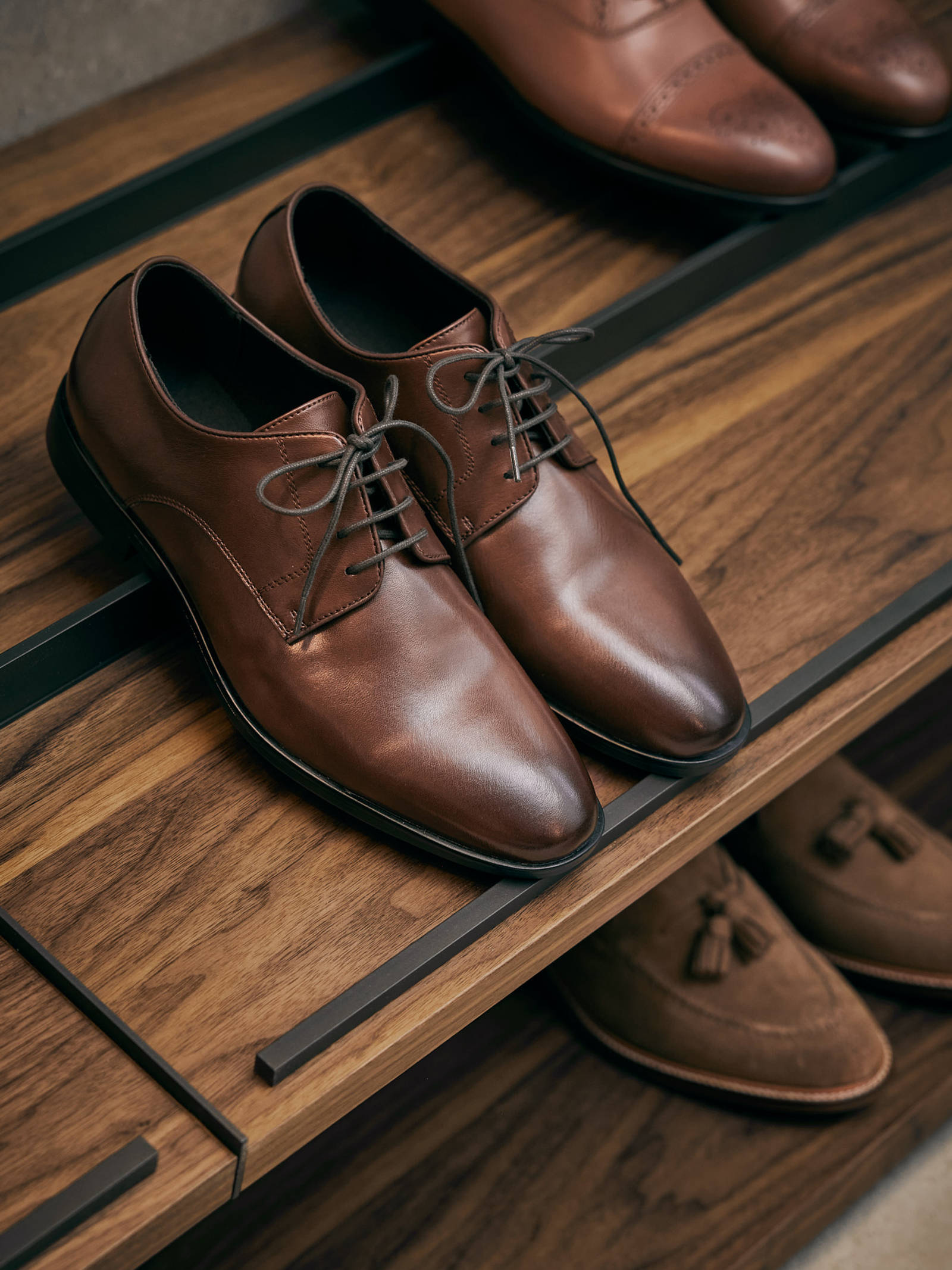 Indretningen fuldendes med aluminiumshylder i en raffineret Brown Metal Grey med bronzefarvet glas eller træhylder – enten med eller uden integreret LED-belysning - skohylder i finer eller laminat og massive træskuffer samlet på klassisk snedkermanér fra vores Copenhagen kollektion. I kollektionen findes også dragtposer i en nøje afstemt nuance – i to længder – og tre varianter af bøjler.