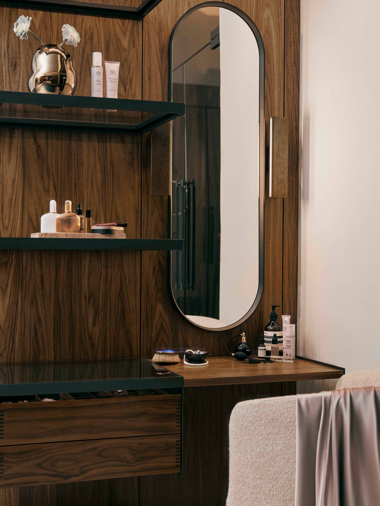 Eksklusiv make-up sektion i valnød dedikeret til make-up og smykker.