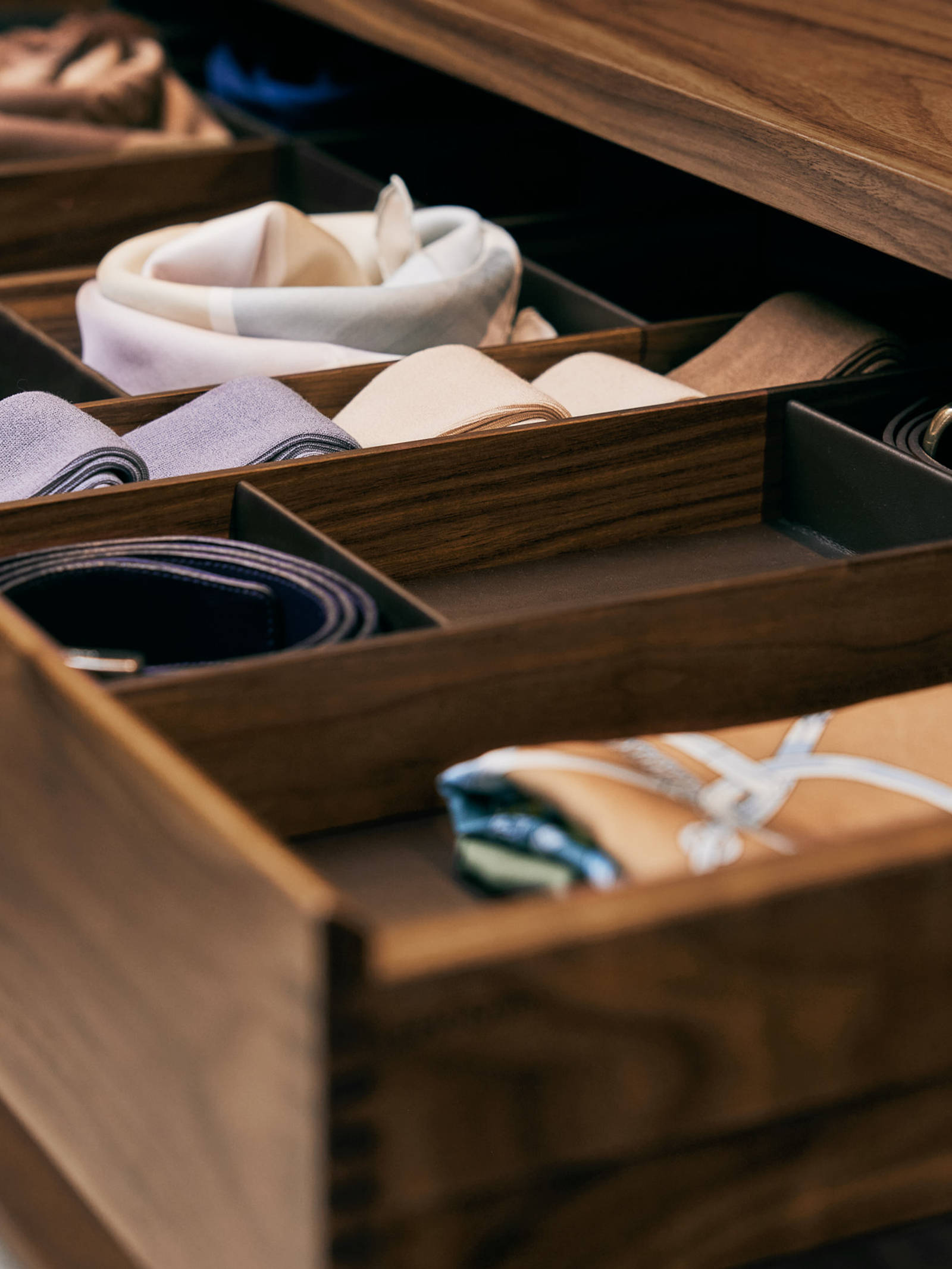 En unik løsning, hvor praktik og luksus går op i en højere enhed. Skufferne rummer alle de ting, du skal huske at pakke i kufferten, og inddelere sikrer overblikket over slips, strømper og lingeri.