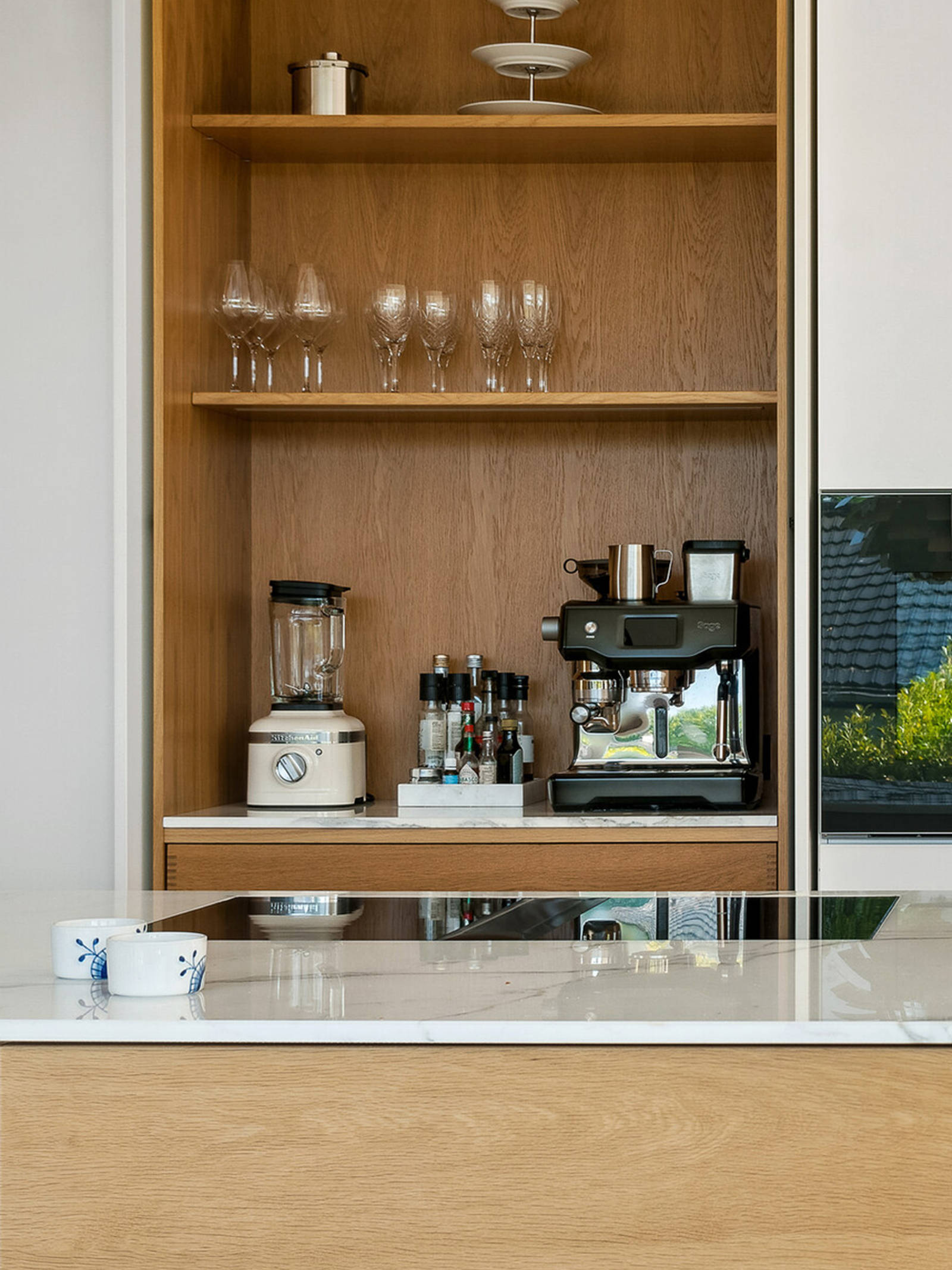 Bagvæggen står som et diskret hvidt møbel med indbyggede hårde hvidevarer fra Gaggenau og integreret vinskab. Det praktiske og smukke pocketdoor skab giver let adgang til kaffestation, blender og krydderier i løbet af dagen og gemmer hurtigt maskinparken væk, når lågerne lukkes. Familiens robotstøvsuger er flyttet ind i soklen og er dermed gemt diskret af vejen.