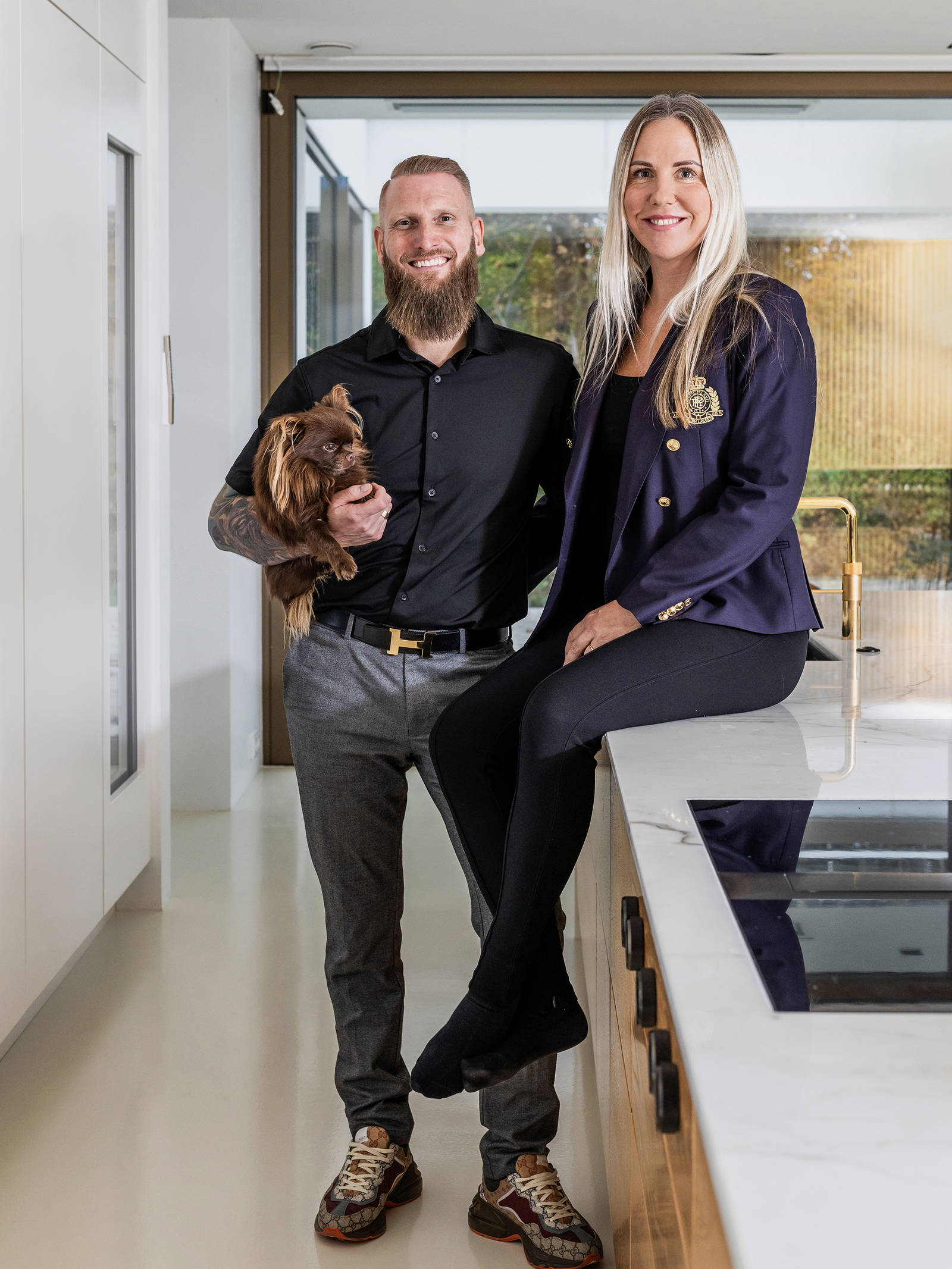 Den store køkkenø i egetræ har skuffer på begge sider, for parret brugte aldrig siddepladserne ved køkkenøen i deres gamle køkken. Bordpladen på øen er skabt af en af verdens mest eksklusive marmortyper, Calacatta Gold, der brydes i bjergene i Carrara i Italien. Den hvide marmor har dramatiske åretegninger i grå og gyldne toner, der bliver fremhævet af et messingarmatur fra Quooker.